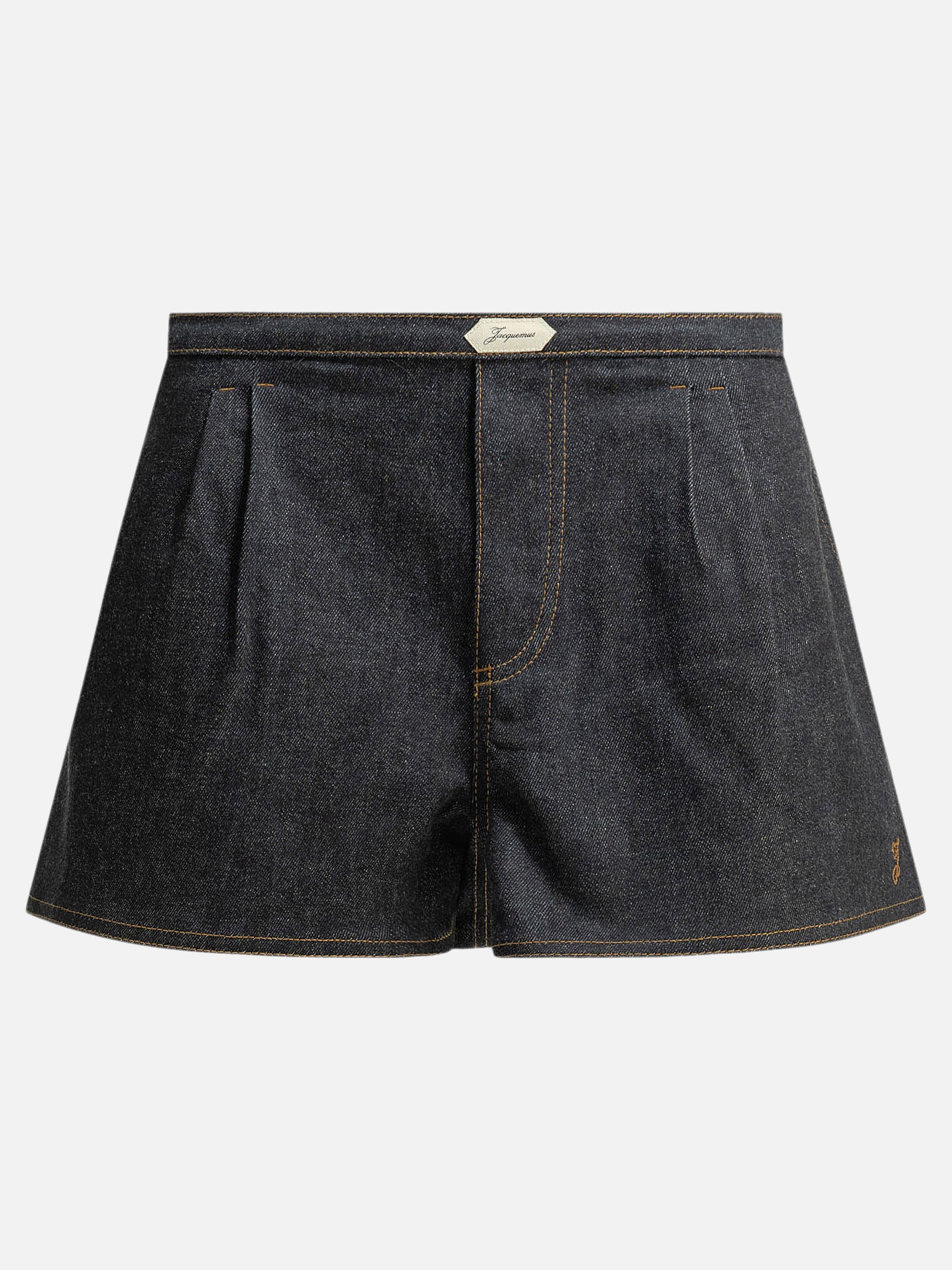 Jacquemus "Amelo de-Nîmes" short made of indigo stretch denim with pleated construction. The silhouette features a mid-rise with an elasticized band at the back and an integrated waistband at the back. Embroidered applique enhances the front waistband, while an embroidered "J" appears on the leg. The structure includes stitched pleats on the front and a mock flap, with no additional detailing on the front.
