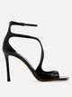 Jimmy Choo "Azia 95mm" sandals with a patent leather upper and asymmetrically positioned contoured straps. Construction features double straps, including an adjustable ankle strap with a buckle closure, and a built-in internal elastic element to aid fit. The construction includes a hand-stitched and hand-applied leather sole, square-toe silhouette, and slim heel.