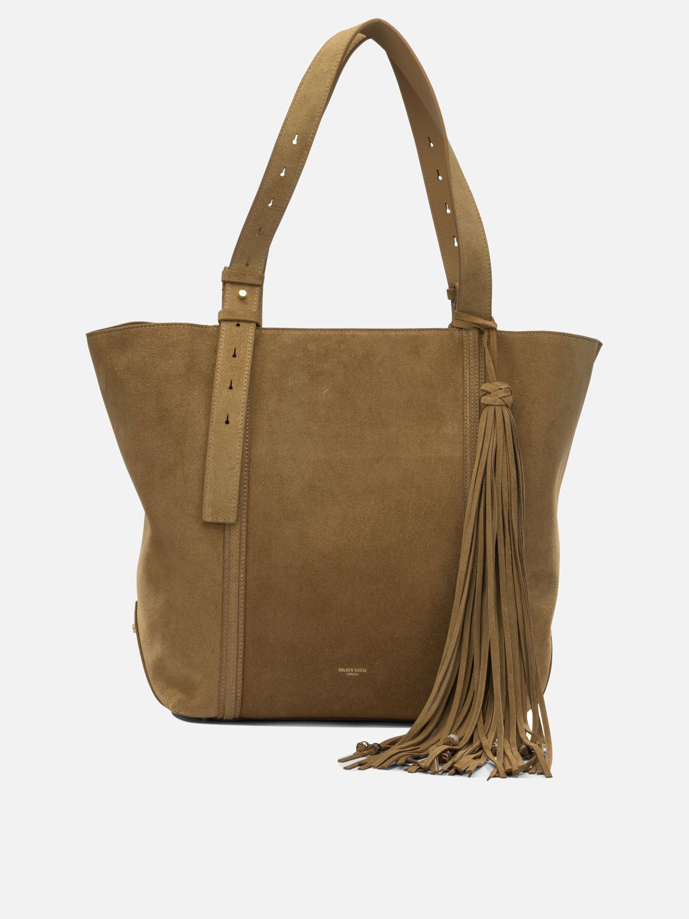 Golden Goose large "East West" shoulder bag, constructed of suede with soft texture and elongated rectangular profile. The main body is composed entirely of cowhide leather, with interior lining made of the same material. Adjustable double handles allow for shoulder carry, while vertical topstitching marks the front panel. The side fringe detail, enriched with micro metal studs, completes the functional aspect of the bag.