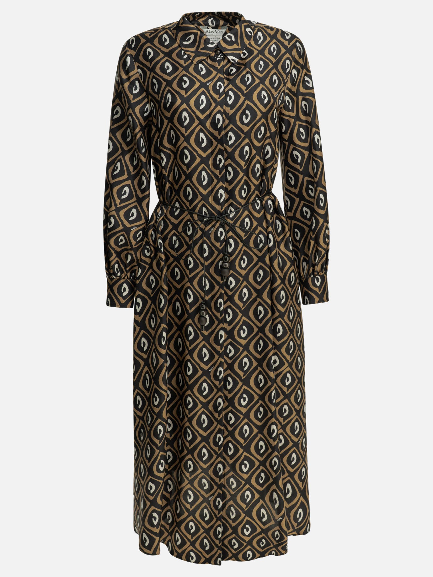 Max Mara long chemisier dress constructed of pure printed silk twill. The structure features a flared line with shirt collar and cuffs, long puff sleeves finished with drop motif at the bottom. Full-length concealed front closure, tubular leather belt with applied wood, horn and resin details. Pockets inserted in hips, garment is unlined.
