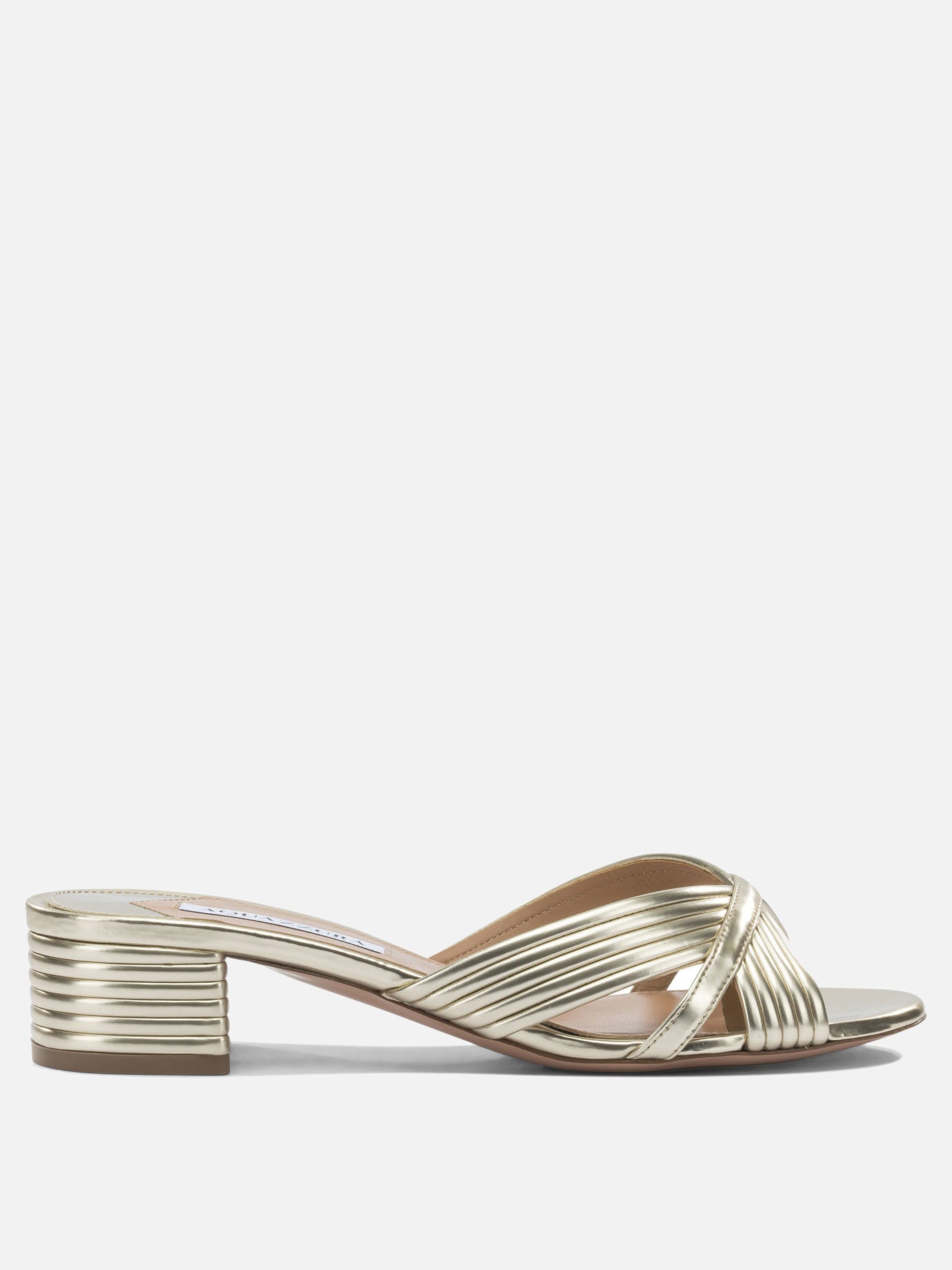 Aquazzura "Sundance 35 mm" heeled sandals, constructed with leather upper and thin straps woven to form crisscrossed bands at the front. The mule model features slip-on construction and an open toe. The structured medium heel provides stability, while the silhouette is balanced and defined by essential lines. The insole is logoed and the sole made of leather. The fit is regular and the construction handcrafted.