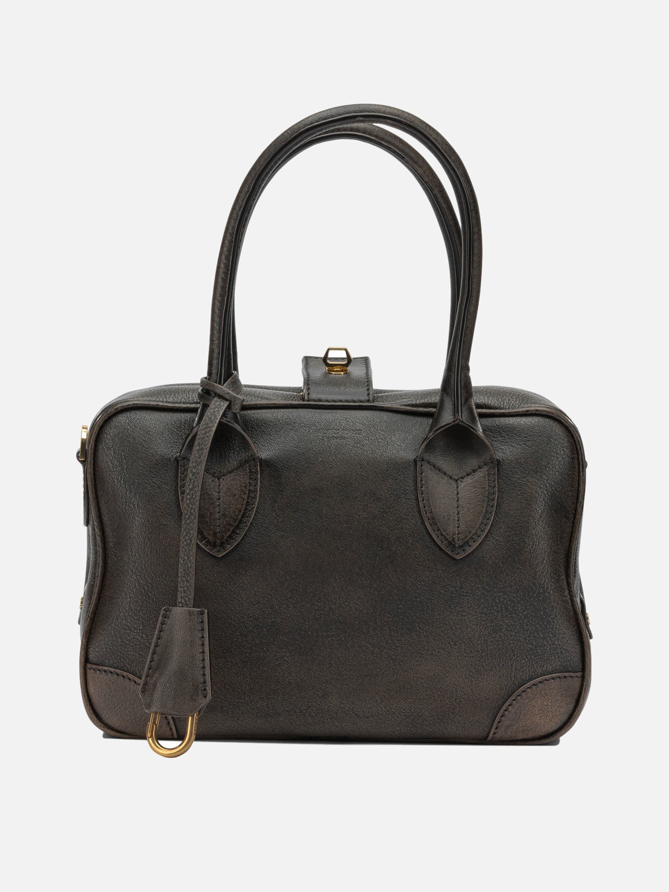 Golden Goose small "Vita" hand bag made of selected materials and compact structure. The model features a defined rigid silhouette, double leather handles on the top panel and structure with a flat base equipped with protective metal feet. The closure includes double top zipper and swivel system with hardware detail. The fabric-lined interior is organized with an interior zipper pocket and a slit pocket.