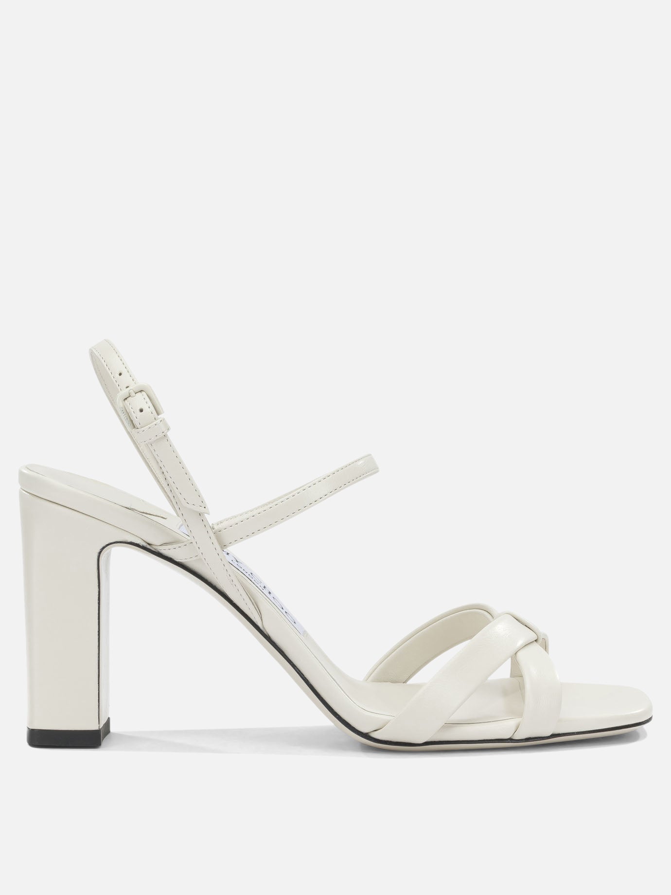 Jimmy Choo "Elsy 85MM" heeled sandals made of smooth, fine-grained leather with a soft, slightly satin surface. Structure with thin straps that wrap around the foot, intersected by an adjustable ankle strap with metal closure. Elongated, contoured line with a wide heel and stable base. Open construction for added breathability and heat-embossed logo detail on the insole.