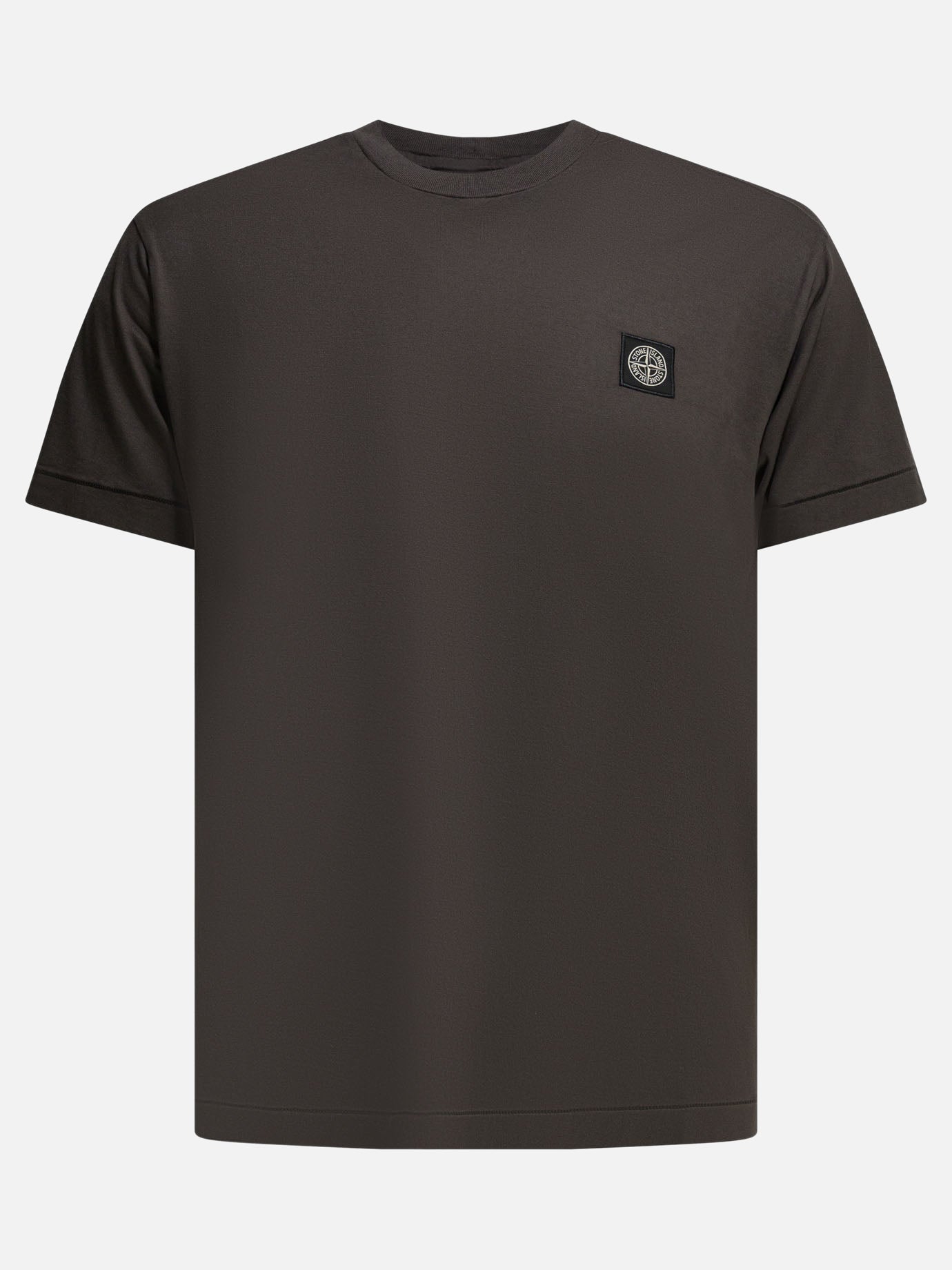 Stone Island logo crewneck T-shirt made of medium-weight cotton jersey. Compass logo patch applied on chest, short-sleeved construction, ribbed finished neckline, hem with raised stitching. The silhouette features a close fit, achieved through essential tailoring and functional details. The garment is garment dyed, giving a uniform texture to the fabric.