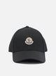 Moncler logo baseball cap constructed of cotton with six-panel construction. The silhouette is semi-rigid with a pre-curved visor and tone-on-tone stitching. A front-applied logo patch identifies the brand. The back adjusts with a metal buckle strap, allowing for a customizable fit. Embroidered eyelets promote the shell's breathability.