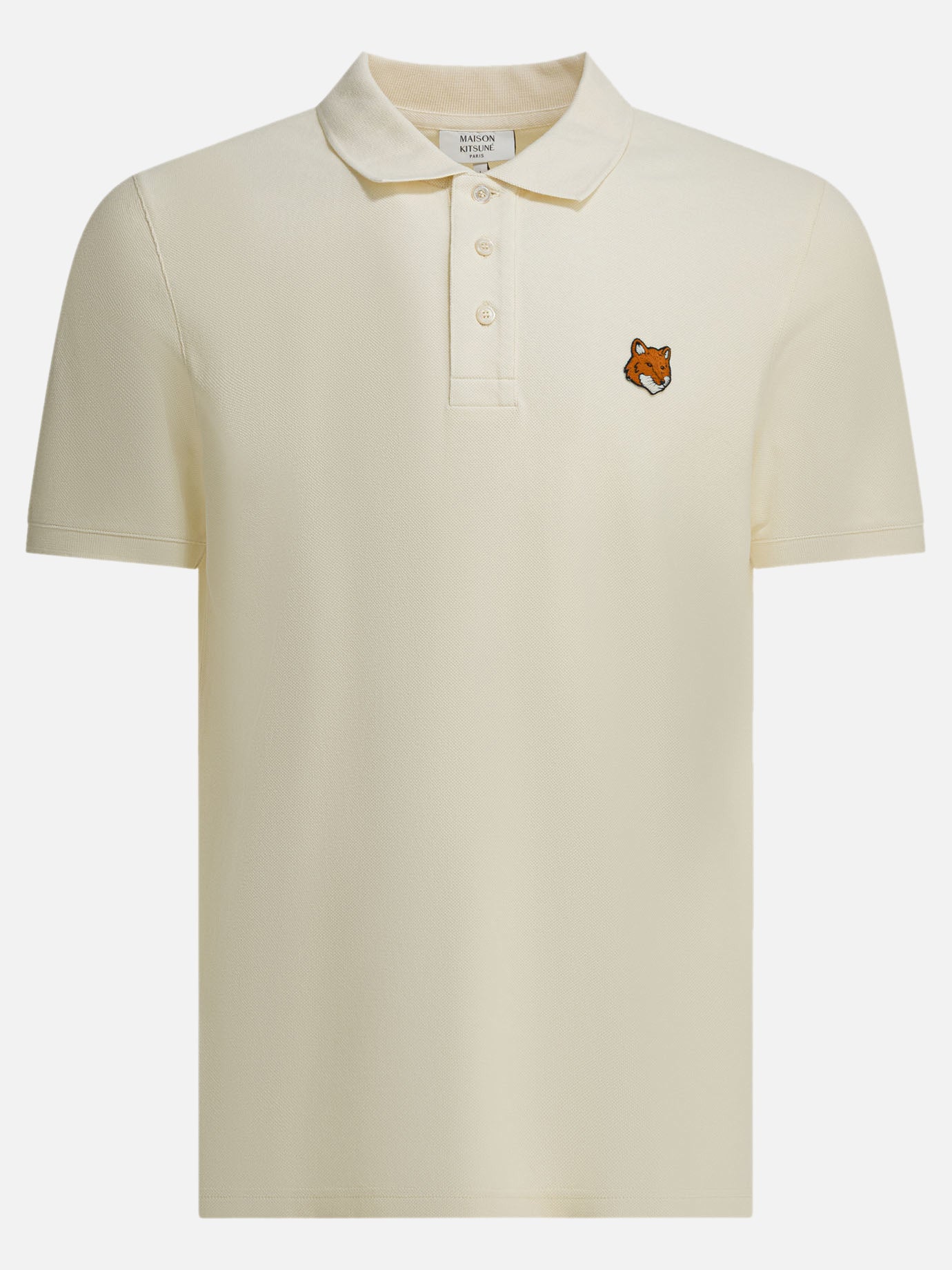 Cotton polo shirt with Maison Kitsuné logo, constructed from cotton pique with a compact structure and textured surface. The silhouette features a regular fit with a straight line, short sleeves, ribbed collar and front button placket. Fox Head embroidered patch detail applied to chest. Ribbed trim on collar and sleeve edge, front buttons engraved with brand name.