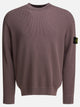Stone Island logo crewneck sweater, constructed from soft organic cotton knitted in 12-gauge ribbed knit. The garment has a regular silhouette and features a neckline, cuffs and bottom band made of ribs of different thicknesses, offering a structured and linear composition. An applied logo badge on the left sleeve identifies the product within the collection.