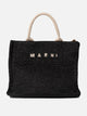 Marni "East/West" handbag in raffia-effect fabric. Compact rectangular structure design, wearable either by hand or on the shoulder thanks to two cotton ribbon handles and a long shoulder strap. Fabric-lined interior with zippered pocket. Palladium-tone metal details. Embroidered Marni logo visible on front.