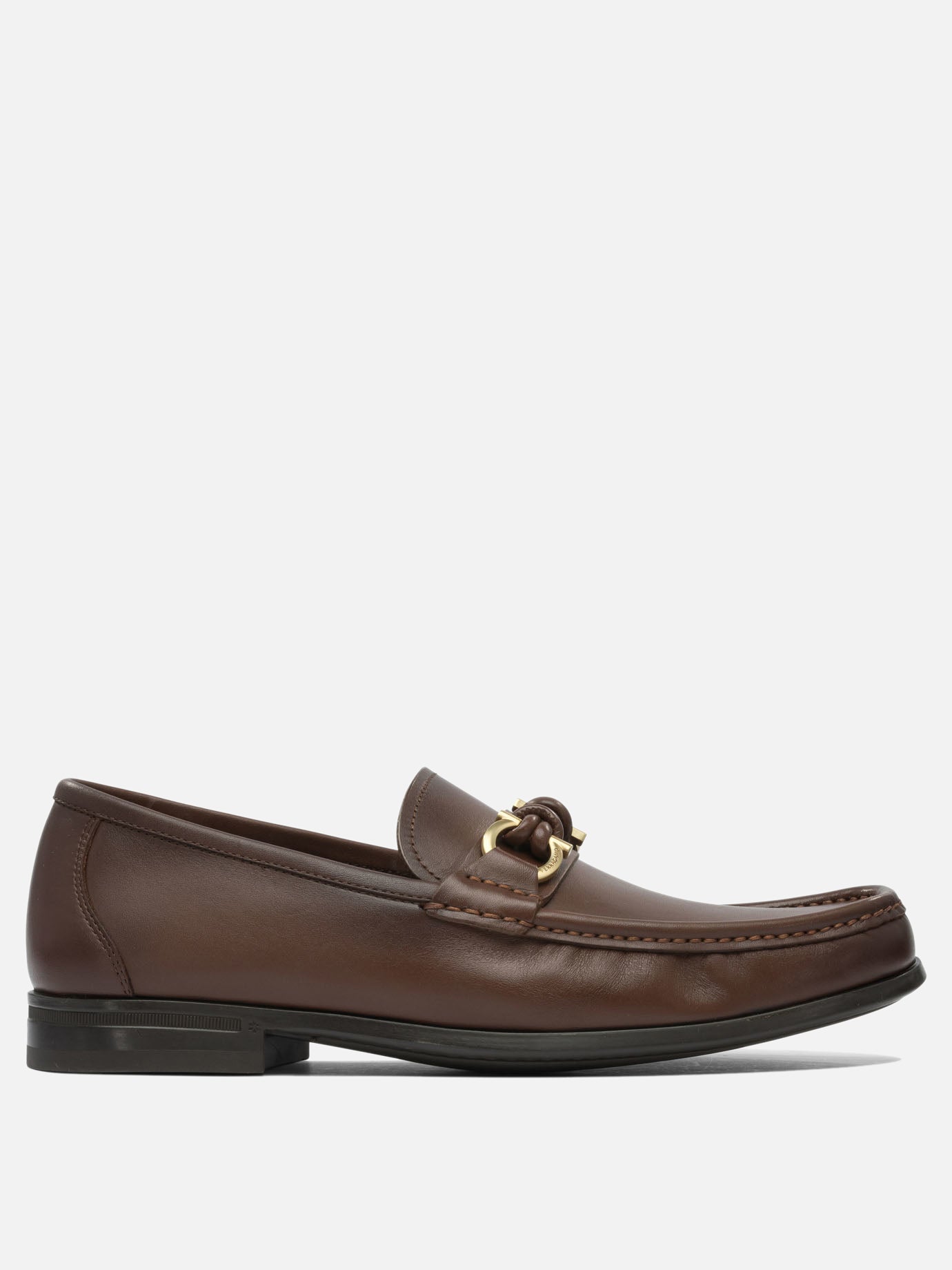 Ferragamo "Gancini" moccasins, constructed with a tubular technique that ensures flexibility and lightness. The upper features a rounded line on the toe and a pinched tray with gathers, joined by the characteristic Gancini metal bar. Handwork for some stitching and assembly steps. Compact silhouette, soft structure and adaptable to the foot.