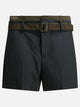 Sacai X Suiting. Tailored shorts with an integrated belt, made from a fabric consisting of 70 percent polyester and 30 percent wool. The structure features a regular silhouette, detailed by sharp lines and prominent seams. Materials include nylon and cupro inserts, which add textural contrast and definition to the garment. The construction follows criteria typical of contemporary tailoring, with attention to functional elements.