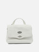 Zanellato small "Postina® Baby" handbag made of leather with a woven effect. The compact, semi-rigid structure defines a geometric silhouette with a slightly curved front bezel. The top handle, designed with 6 cm span, is integrated to the bag body by reinforced stitching. The double-button closure is inserted under the flap. The interior is lined, with a divider and spaces dedicated to essentials.