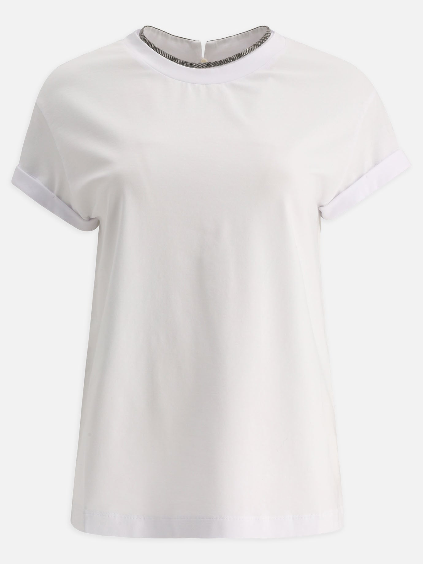 T-shirt in jersey di cotone con Precious Faux Layering Brunello Cucinelli caratterizzata da una costruzione in tessuto leggero e morbido con aggiunta di una piccola percentuale di elastan per maggiore comfort. La struttura include maniche corte con risvolto e un girocollo rifinito da ricamo in monile nickel-free, disposto lungo il bordo. Sul retro, apertura a goccia fissata da bottone. Silhouette regolare, con caduta dritta e dettagli essenziali.