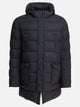 Piumino lungo con cappuccio Herno con costruzione imbottita, realizzato in misto lana e piuma d'oca. Presenta una silhouette lineare, struttura a lunghezza estesa e cappuccio integrato. La chiusura frontale è nascosta da una zip, mentre le maniche sono lunghe. La parte frontale include due tasche a filetto sul petto e due tasche con pattina. L'orlo è dritto e il design punta sulla funzionalità e sulla protezione dagli agenti esterni.