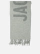 Sciarpa "L'Echarpe" Jacquemus, realizzata in lana a filato tinta unita, presenta una struttura morbida e una silhouette rettangolare lineare. Il logo Jacquemus è lavorato in jacquard all'interno della trama, contribuendo all'aspetto testurizzato del tessuto. Sono applicate frange di 12 cm su entrambe le estremità, caratterizzando la rifinitura. La costruzione risulta priva di cuciture visibili, mantenendo un bordo pulito su entrambi i lati lunghi.