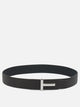 Cintura reversibile "T Icon" Tom Ford, realizzata con pelle morbida e struttura a doppia faccia che permette di indossare entrambi i lati. La silhouette è lineare, priva di cuciture visibili sul bordo superiore e inferiore. La fibbia a forma di T in metallo lucido è fissata tramite un sistema di chiusura a incastro che garantisce una regolazione stabile sulla lunghezza desiderata. Struttura rigida e compatta, rifinitura liscia su tutta la superficie.