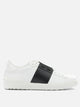 Sneaker "Open" Valentino Garavani presenta una tomaia in vitello con superficie uniforme e struttura lineare. La silhouette è arrotondata nella parte anteriore, con una banda centrale in pelle a contrasto integrata nella costruzione. La chiusura è fornita da lacci piatti, mentre la suola in gomma liscia si estende fino al retro, dove sono applicate borchie in gomma come dettaglio funzionale. La fodera interna è realizzata completamente in pelle.