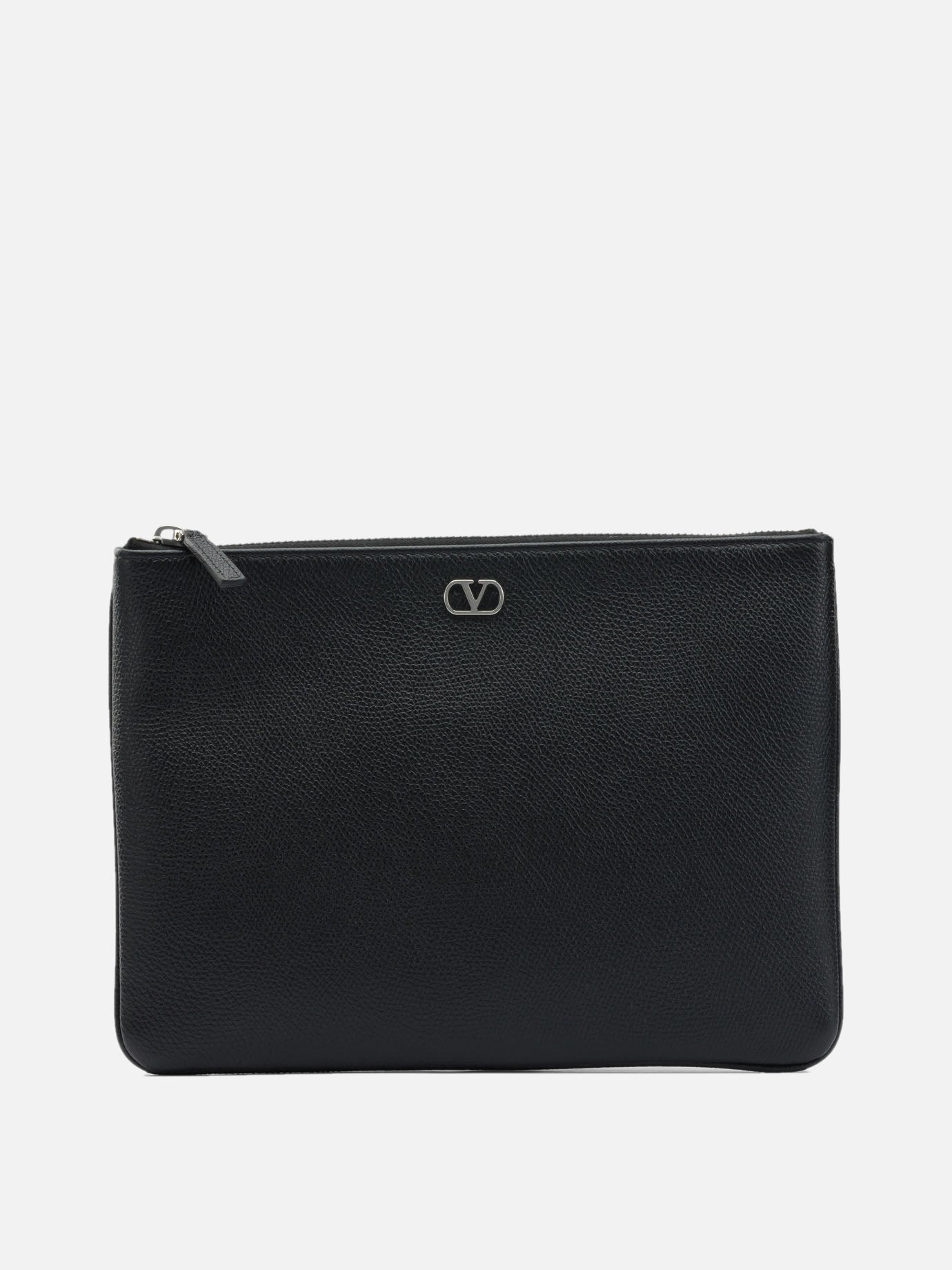 Pouch "Vlogo" Valentino Garavani in pelle granata, caratterizzata da una struttura piatta e una silhouette rettangolare. L'applicazione frontale del logo VLogo risulta integrata nella superficie, con chiusura superiore a zip per la protezione del contenuto. L'interno è foderato e include tre vani portacarte. La costruzione privilegia linee nette e bordi rifiniti, rispondendo a una logica di minimalismo funzionale.