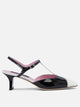 Sandali "Isadora 40mm" Carel con tomaia realizzata in pelle verniciata, struttura salomé con dettagli cut-out a contrasto. La costruzione artigianale in pelle a pieno fiore viene completata con una suola in cuoio e fodera interna in pelle. La silhouette si distingue per il tacco a spatola leggermente svasato, scolpito e laccato, che offre stabilità e una linea grafica marcata.