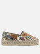 Espadrilles in cotone Etro con tomaia in gabardine di cotone e motivo floreale stampato a copertura totale. La costruzione prevede una suola in juta intrecciata e silhouette slip-on. Un'etichetta laterale in pelle con Pegaso e logo Etro aggiunge elemento distintivo. Soletta interna logata. Struttura morbida e leggera, progettata per adattarsi al piede senza elementi aggiuntivi di chiusura o regolazione.