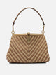 Borsa a spalla "Vela" piccola Etro, realizzata con intreccio di rafia e pelle. La costruzione presenta una struttura rigida e una silhouette compatta. Chiusura in metallo con dettaglio moneta Pegaso ottenuta tramite coniatura. Il manico è removibile per diversi livelli di portabilità. Gli accessori metallici sono rifiniti con trattamento dorato che completa la configurazione funzionale del prodotto.