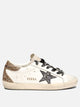Sneaker "Super-Star" Golden Goose con tomaia realizzata in pelle bovina e struttura bassa. La sagoma presenta una costruzione lineare con stella applicata lateralmente in suede, talloncino in pelle, e inserto posteriore in suede. Fodera interna composta da pelle bovina e cotone per una sensazione di comfort uniforme. Suola in gomma flessibile e resistente, rifinita con trattamento vintage manuale che valorizza la texture superficiale.