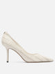 Décolleté "Love 85 mm" Jimmy Choo, modello costruito con tomaia in pelle di vitello e silhouette a punta. La struttura è formata da un tacco sottile, con rivestimento continuo in pelle. La suola è scolpita a mano in cuoio, conferendo stabilità e definizione al profilo. Un bottone applicato sul retro reca il logo JC, elemento identificativo del brand. La finitura rispetta una linea precisa e senza cuciture visibili.