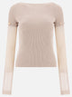 T-shirt girocollo Max Mara Sportmax in viscosa stretch di media pesantezza, caratterizzata da linea regolare e struttura aderente. Il capo presenta scollo a barchetta e maniche lunghe rimovibili, in viscosa trasparente, fissate tramite bottoncini personalizzati. Calature frontali disegnano la linea del seno. La costruzione combina una maglia compatta e dettagli funzionali pensati per modularità e versatilità d'uso.