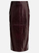 Gonna midi in pelle Max Mara Sportmax, realizzata in nappa dal finish semi lucido e costruita con una struttura dritta. Presenta un taglio geometrico enfatizzato da impunture tono su tono che segnano i pannelli. La silhouette si sviluppa in lunghezza longuette e incorpora pince e spacco posteriore coperto. La chiusura è affidata a una zip invisibile posizionata sul retro.