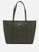 Borsa tote "Toni" Mcm, costruita in tela Visetos con struttura semirigida e profili definiti. I manici superiori sono realizzati in pelle e fissati con cuciture visibili. La silhouette ampia è completata da una chiusura superiore con cerniera e dettagli funzionali interni. Gli elementi in metallo color cobalto argento e la targa con logo in ottone caratterizzano la finitura.
