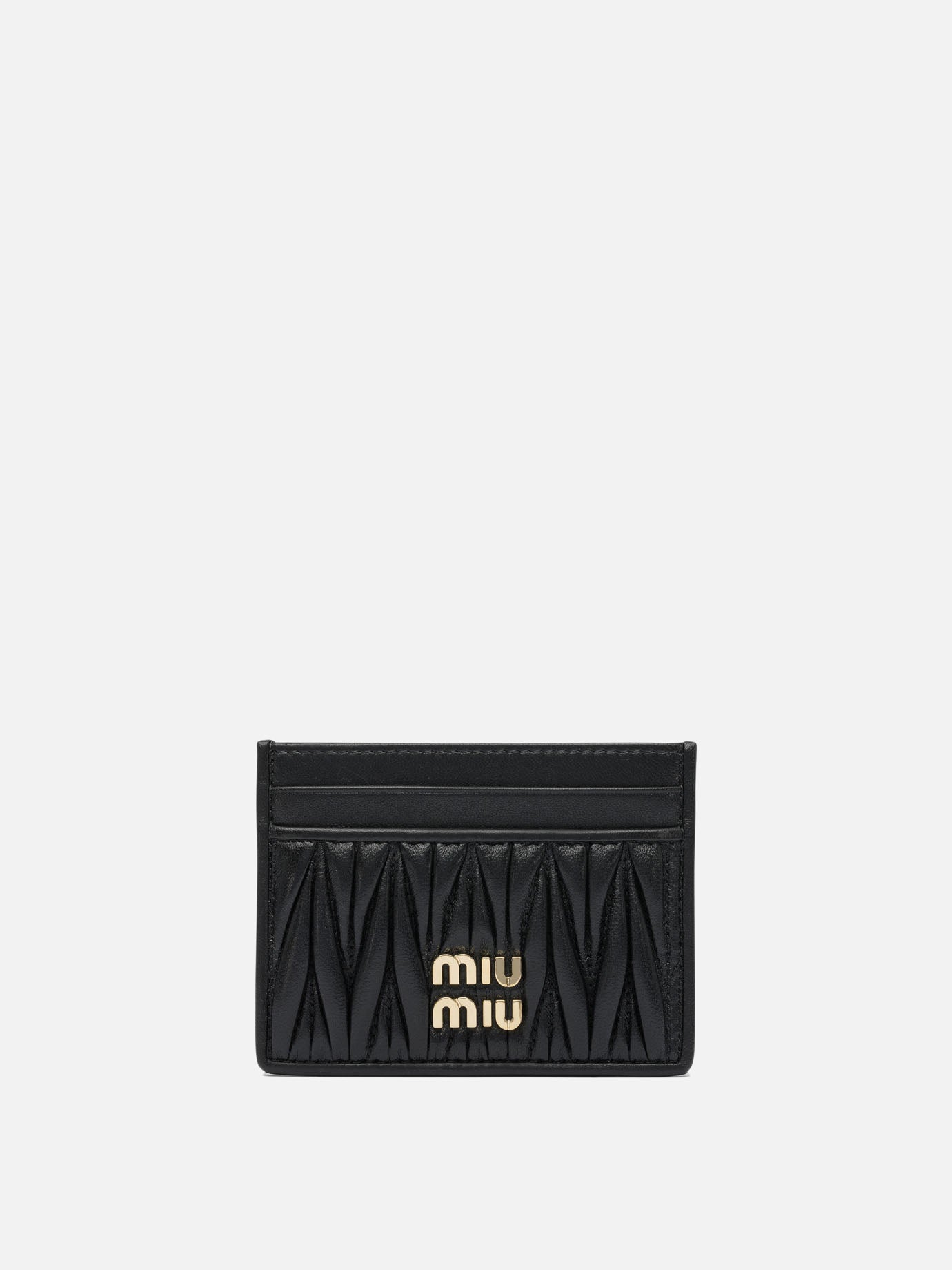 Portacarte in nappa matelassé Miu Miu, costruito in pelle lavorata a effetto matelassé con silhouette compatta e linee semplici. La struttura integra sei slot portacarte, organizzati in file parallele, pensati per distinguere e contenere carte e documenti essenziali. La superficie esterna presenta un logo lettering verticale in metallo applicato in rilievo. L'interno è rifinito con fodera in moirè, scelta per resistenza e uniformità.