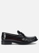 Mocassini in pelle spazzolata Prada con struttura monopezzo e linea essenziale. La tomaia è realizzata in pelle di vitello, rifinita con lavorazione a specchio e dettagli strutturali puliti. La silhouette presenta un profilo squadrato, interrotto dal morsetto centrale applicato in pelle. L'assemblaggio artigianale definisce volume regolare e geometria stabile. La suola è in gomma compatta con transizioni regolari e profilo monoblocco.