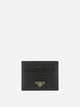 Portacarte in pelle Saffiano Prada, realizzato con texture incisa a micro trama. La struttura compatta presenta linee essenziali e bordi rifiniti a taglio vivo. Sei slot per carte sono integrati su entrambi i lati, completati da una tasca interna centrale. Il logo Prada su triangolo in metallo smaltato, applicato sulla superficie, segnala l'identità del marchio. La fodera interna accoppia moiré e pelle Saffiano per maggiore resistenza.