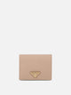 Portafoglio in pelle Saffiano Prada, costruito con superficie strutturata e cuciture lineari. La silhouette è compatta, con chiusura a bottone a pressione. All'interno sono presenti una sezione portabanconote, tre slot per carte, due tasche interne e un portamonete con pattina. La forma rettangolare garantisce organizzazione per carte e contanti. Il logo triangolo in metallo smaltato è applicato sulla parte frontale. Fodera interna in moirè e pelle Saffiano.