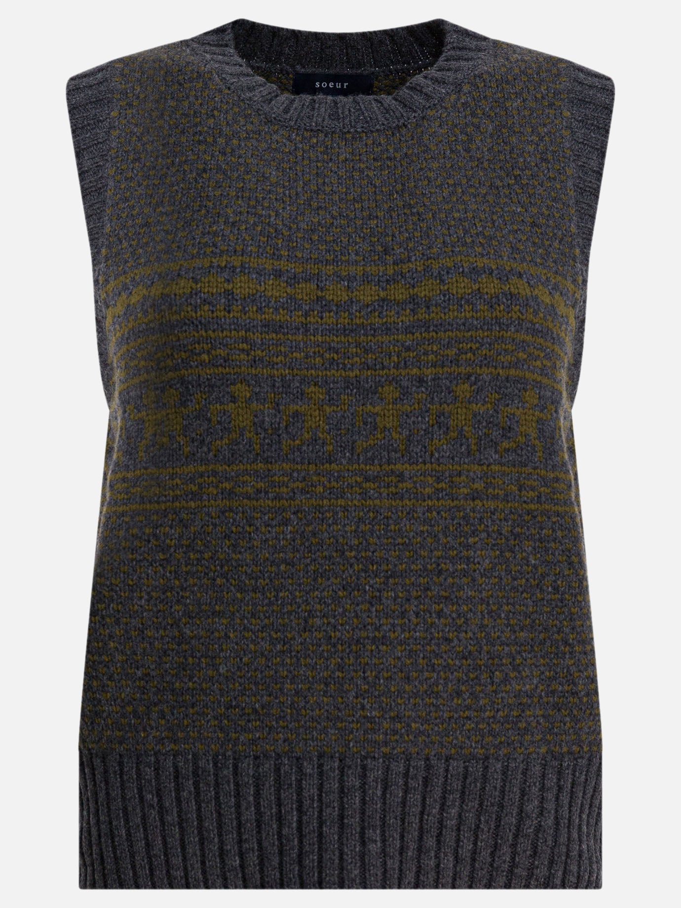 Maglione smanicato "Namaste" Soeur, realizzato in lana merino con struttura jacquard. Presenta silhouette dritta, priva di maniche, caratterizzata da un collo rotondo e bordi rifiniti a costine su scollo, giromanica e orli. La costruzione a maglia esalta la compattezza del filato, garantendo una superficie coerente e una mano regolare. Il taglio essenziale valorizza la costruzione della maglieria e i dettagli tecnici della lavorazione.