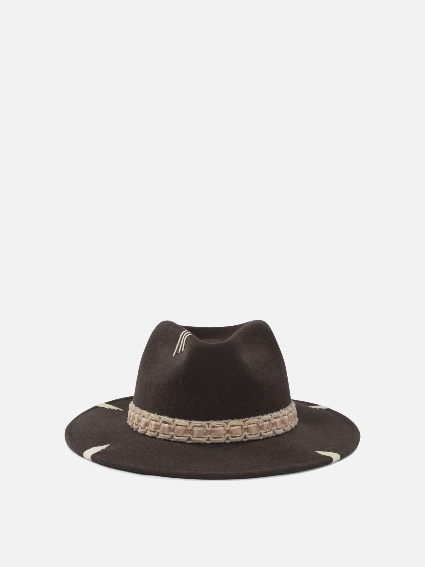 Cappello "Over The Moon" The Hat Gang, realizzato in lana e caratterizzato da una costruzione strutturata. La superficie ospita una scritta ricamata “Over The Moon” e motivi decorativi eseguiti a mano, visibili sul pannello, che seguono la silhouette tradizionale del modello. Il bordo netto e sagomato offre stabilità, mentre la tessitura compatta garantisce solidità alla forma. Gli elementi ricamati creano rilievi percepibili al tatto.