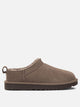 Stivaletti "Classic Micro" Ugg, costruiti con una tomaia in vero camoscio foderata internamente in montone a doppia densità. La struttura è definita da un profilo basso e compatto, con bordo in tessuto realizzato con fibre di poliestere riciclato. La suola leggera in EVA da canna da zucchero bilancia leggerezza e supporto, mentre il tirante posteriore permette una calzata funzionale. L'etichetta in pelle con logo in rilievo completa il design.