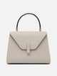Borsa a mano "Iside" mini Valextra, costruita in pelle di vitello Millepunte con struttura compatta e superfici rigide. La silhouette geometrica evidenzia linee nette e bordatura nera laccata applicata a mano. L'apertura è regolata da una chiusura rettangolare in metallo dorato, rifinita da un inserto in pelle. La tracolla regolabile e rimovibile consente varie modalità di trasporto. Gli interni sono minimal e mantengono la forma definita.