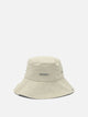 Jacquemus "De-Nîmes" bucket hat features a cotton-linen blend fabric construction with a structured silhouette and stitched visor. The design incorporates visible seams and a long, adjustable strap. Side snaps allow shape adjustment, while ventilation eyelets, made in both circular and square shapes, provide ventilation. The back drawstring, with circular and square elements, provides additional adjustability to the fit.