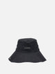 Jacquemus "De-Nîmes" bucket hat features a cotton-linen blend fabric construction with a structured silhouette and stitched visor. The design incorporates visible seams and a long, adjustable strap. Side snaps allow shape adjustment, while ventilation eyelets, made in both circular and square shapes, provide ventilation. The back drawstring, with circular and square elements, provides additional adjustability to the fit.