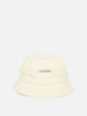 Jacquemus "Gadjo" bucket hat made of cotton with compact texture and soft structure. The construction features a rounded dome and flexible brim finished with prominent topstitching along the edge. The design incorporates an adjustable drawstring with visible topstitching, to be tied at the back, which helps define the functional silhouette. Distinctive silver metal logo detail applied to the side.