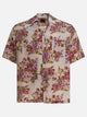 Kapital "Aloha" shirt made of silk-blend cupro, featuring lightweight texture and smooth surface feel. Regular silhouette with short sleeve construction, wide and long camp collar. The front features champêtre motif with bouquets of flowers, while the back shows a print depicting Mary holding cookies. Details finished with linear stitching and front button closure.