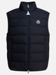 Moncler "Contrin" sleeveless vest. Sleeveless vest with straight silhouette, constructed of polyester with down and feather filling. Polyester inner lining. Raised collar for additional coverage. Full-length zipper front closure. Two side snap pockets and one inside zipper pocket. Bottom hem finished with logo detail. Regular construction designed for everyday layering.