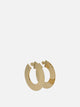 Alaïa "Blade Small" hoop earrings, made of aluminum and brass, feature a rigid hoop structure with a sharp, geometric profile. The slim silhouette is defined by essential lines and sharp edges. The design designed for pierced ears ensures precise insertion and a light visual presence. The diameter measures 50 mm, ensuring a balanced and functional proportion to the construction of the jewelry.