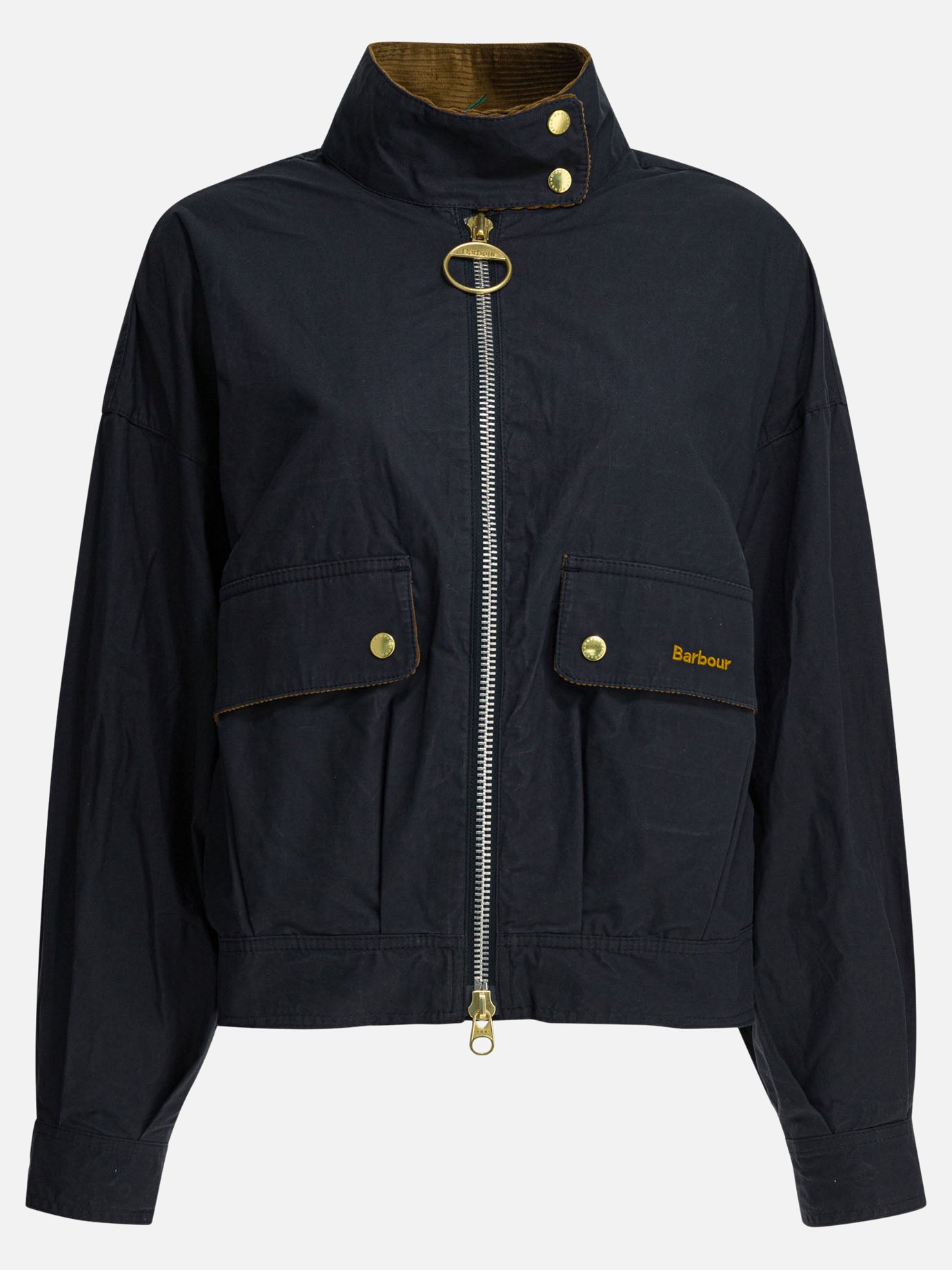 Giacca leggera "Blackthorn" Barbour, costruita in cotone asciutto al tatto, presenta una silhouette corta ispirata al modello Harrington. La struttura include maniche scivolate, orlo e polsini ampi, colletto con cinturino dotato di due bottoni a pressione e tasche frontali con patta chiuse da bottoni a pressione. Foderata parzialmente nella parte superiore con motivo tattersall, offre dettagli pensati per l'uso quotidiano e urbano.