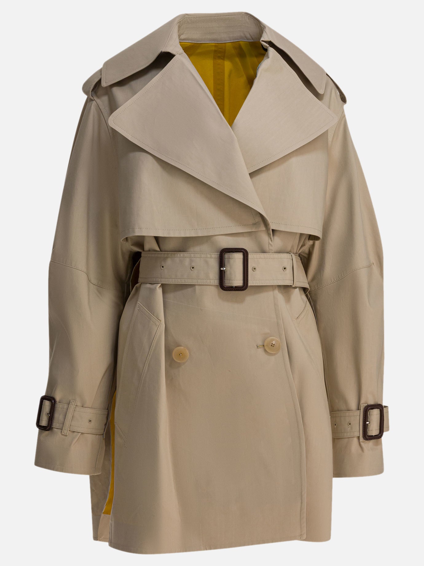 Givenchy cotton trench. Crafted from cotton canvas, the short trench coat features a compact construction with classic lapels and front button closure. Contrasting lining and bias stitching help maintain a wrap-around volume. Two side pockets complement the essential construction. The design is completed with an adjustable and removable belt with leather buckle, as well as adjustable tabs on the cuffs.