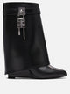 Givenchy "Shark Lock" 90mm boots made of smooth calfskin with a tube construction. The line features a leather top band with Givenchy logo metal clasp. A 4G Lock with silver finish is applied on the right side, while a Givenchy metal lock with gold and silver finish appears on the left side. Almond toe and covered wedge heel complete the design.