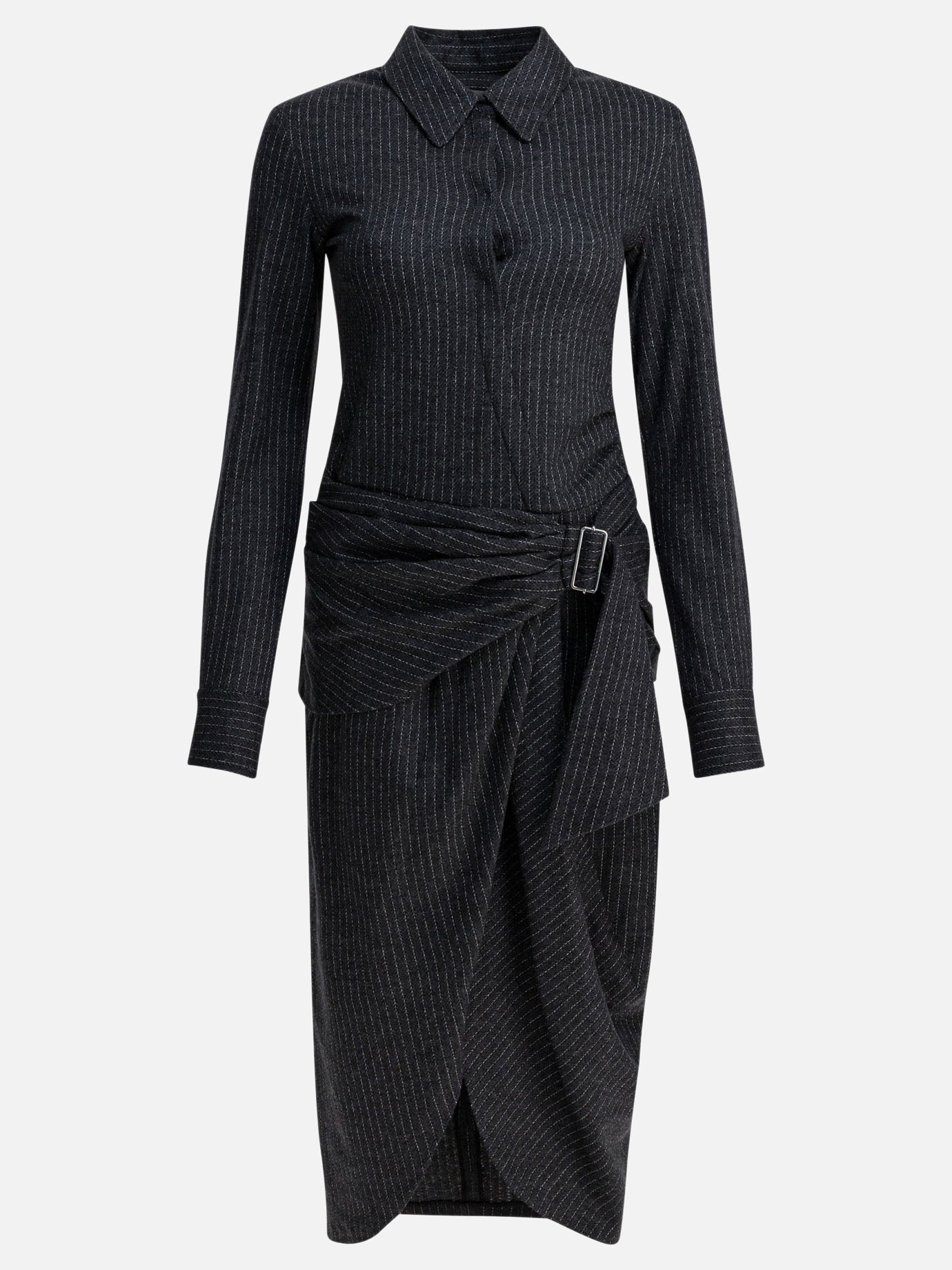 Isabel Marant virgin wool "Rosalie" dress with chemiser construction and straight silhouette. The structure features a front button closure and wallet detail at the waist that can be adjusted via a coordinating belt. Long sleeves are finished with button-finished cuffs. Made of fabric composed mainly of virgin wool and cotton, it features a uniform fabrication and a compact surface. The fall of the garment follows essential lines without noticeable decorative seams.