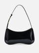 Jacquemus "Le Bisou" shoulder bag constructed of glacé calfskin with a smooth surface and rigid structure. The compact silhouette features an edge-to-edge construction and an adjustable leather shoulder strap with buckle and engraved metal beaded details. The top closure is a continuous zipper. The interior includes a fabric patch pocket for storing small items.