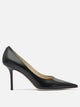 Jimmy Choo "Love 85 mm" pumps, a constructed model with calfskin upper and pointed silhouette. The structure is formed by a slim heel with a continuous leather overlay. The sole is hand-carved from leather, lending stability and definition to the profile. An applied button on the back bears the JC logo, an identifying element of the brand. The finish respects a precise line with no visible stitching.