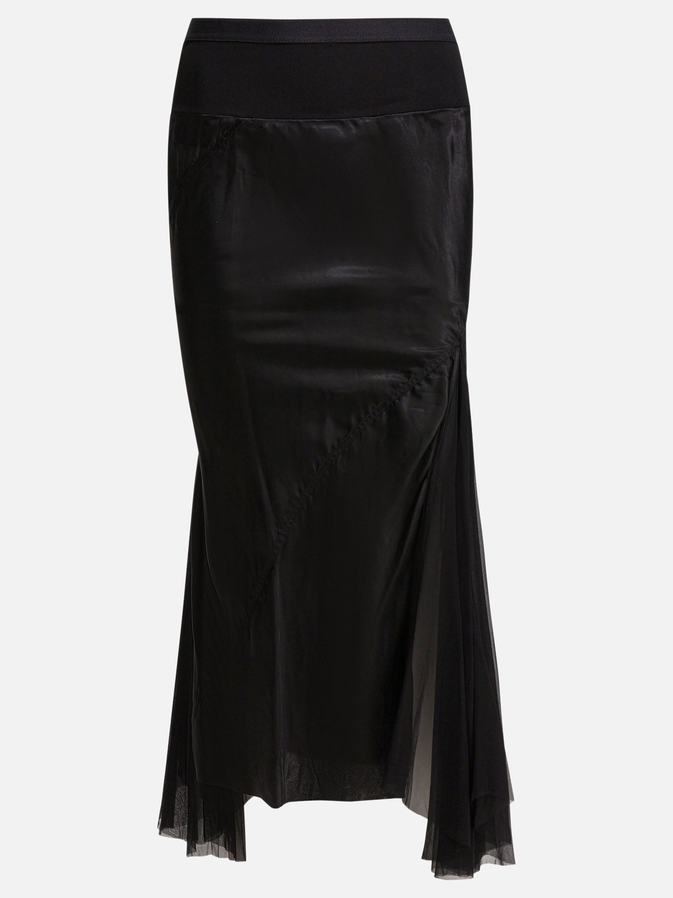 Gonna midi "Bias" Rick Owens, realizzata in cupro leggero a struttura fluida, costruita con taglio sbieco per un effetto drappeggiato che segue la linea del corpo. Il modello presenta una silhouette aderente sui fianchi con apertura progressiva verso il fondo, orlo asimmetrico e inserti semi-trasparenti. La fascia elastica in vita definisce la struttura e assicura stabilità alla vestibilità. Caduta morbida sottolineata dalla superficie leggermente lucida.